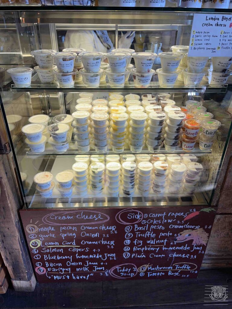 餐台上的貝果玲瑯滿目,店員也會一直補貨。羊堡挑了蔥奶油乳酪貝果和藍莓貝果,還點了兩杯拿鐵,再外帶一個無花果貝果。除了羊堡挑的這幾個,還有非常多種類的貝果,像是:松露奶油、黑橄欖、臘腸辣椒起士口味等等。店內還有販賣兩種濃湯、各種咖啡飲品、和貝果抹醬。