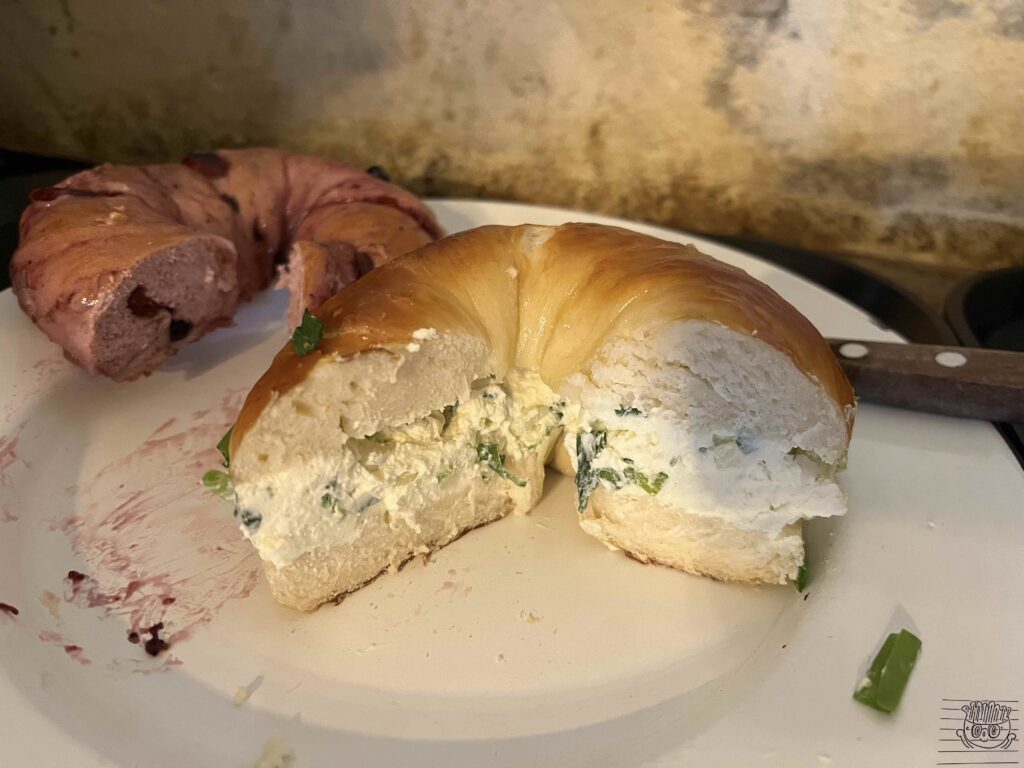羊堡非常喜歡蔥奶油乳酪貝果,他們的貝果很有嚼勁,但也不會到嚼了牙齒痛的那一種,蔥奶油奶酪就是cream cheese拌一點蔥花在裡面,是屬於鹹的貝果,不管搭咖啡或是濃湯都非常適合。